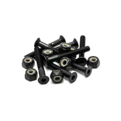 Kit de montaje compuesto por 8 tornillos de acero con cabeza tipo Phillips de 1" de largo y 8 tuercas de acero autofrenantes. Se utilizan para montar los trucks a las tablas de skate.